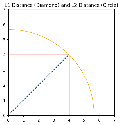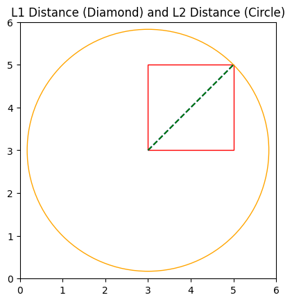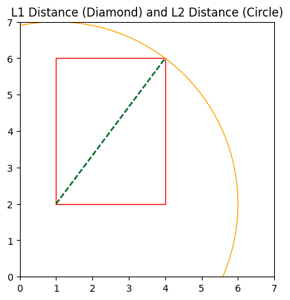 ax.set_title('L1 Distance (Diamond) and L2 Distance (Circle)')