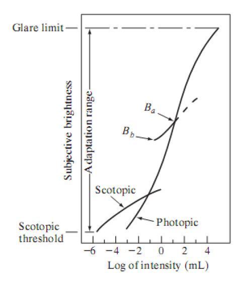 여기서 한 가지 눈여겨 봐야 하는 것은 인간의 시각 시스템은 이렇게 동적으로 변환되는 범위에서 동시에 작동하지 않는다는 것이다. 오히려 전체 감각을 변화시켜 이러한 큰 변환을 달성한다. 즉 어두운 상황에서 암소시 시스템이 작동하다가 점점 밝아져서 명소시 시스템이 겹쳐서 발생하는 상황이 오면 그때는 명소시 시스템이 작동하게 된다. 이를 밝기 적응(brightness adaptation) 이라 한다. 또한 어떤 주어진 조건하에서 시각 시스템의 현재의 감각 단계를 밝기 적응 단계(brightness adaptation level) 라 한다.
