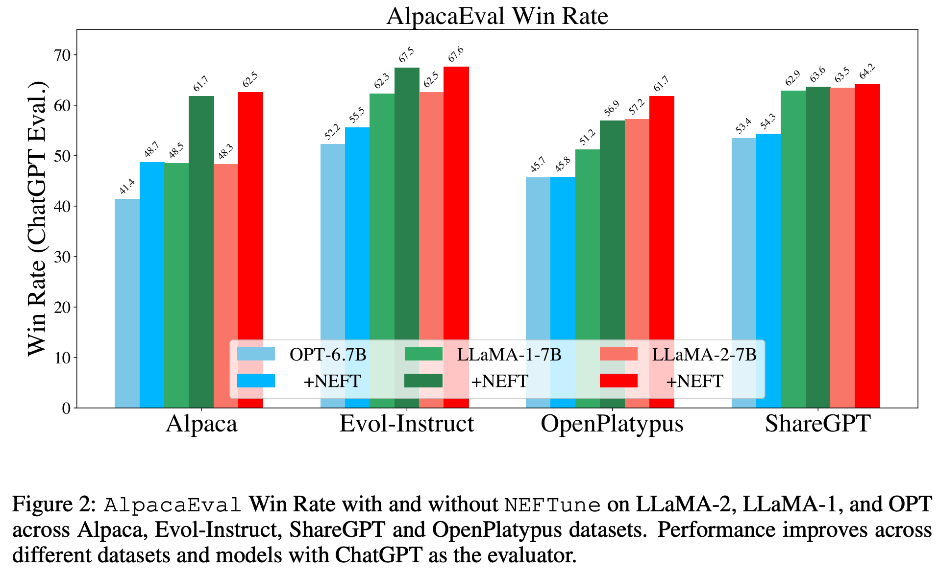 - NEFTune을 사용한 LLaMA-2-7B 모델로 실험을 했을 때, AlpacaEval 데이터셋에서의 성능이 29.8%에서 64.7%로 약 35%p 상승하였음