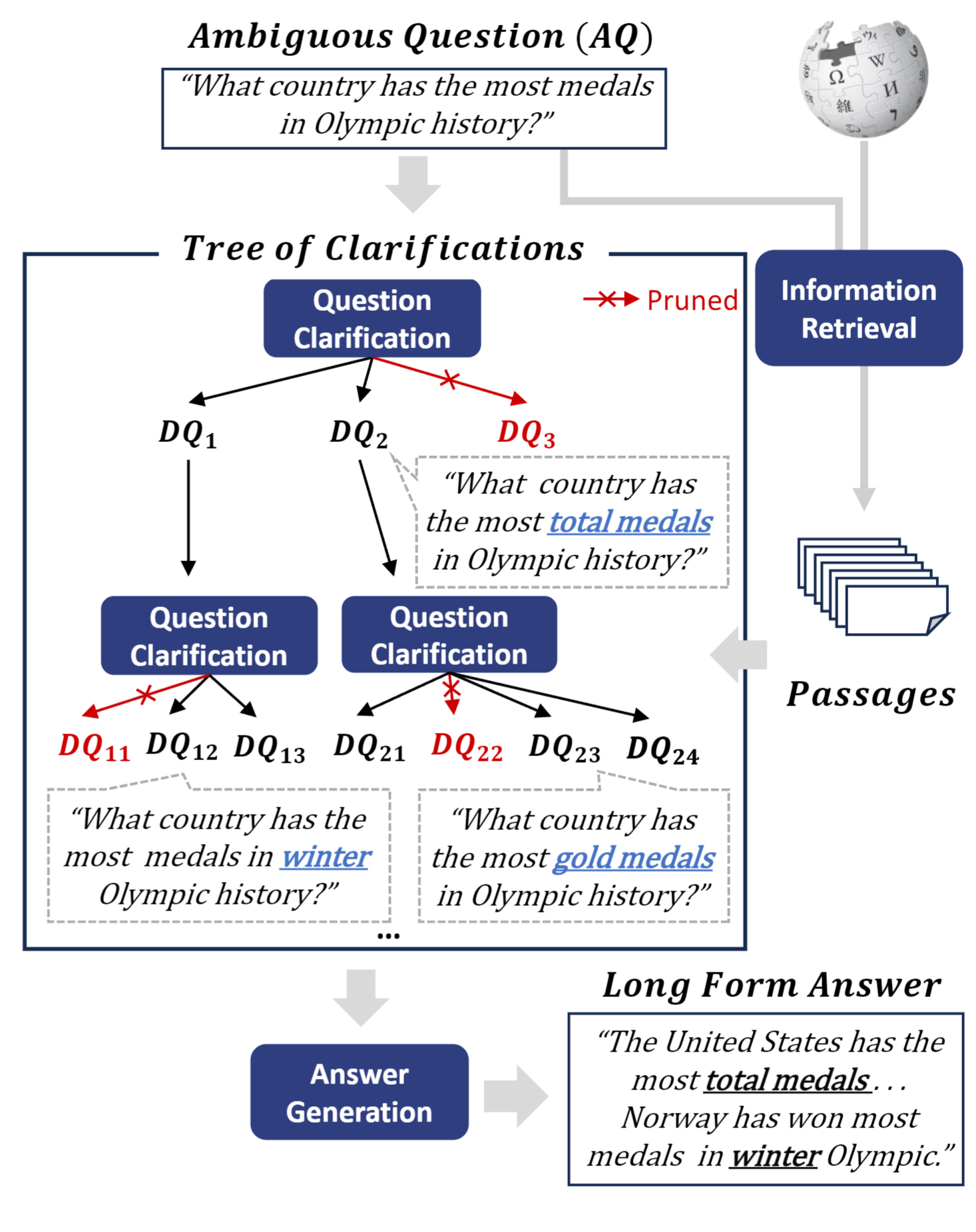 Open-domain question answering (ODQA) task에서 사용자들은 종종 ambiguous questions (AQs)를 질문할 때가 있는데, 이러한 AQs는 여러 뜻으로 해석 될 수 있는 문제점이 있음