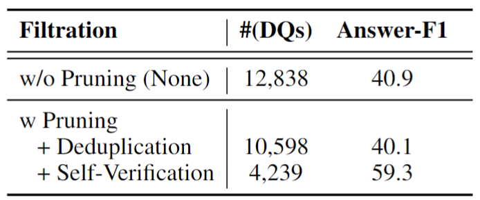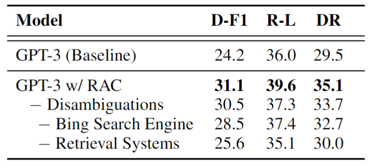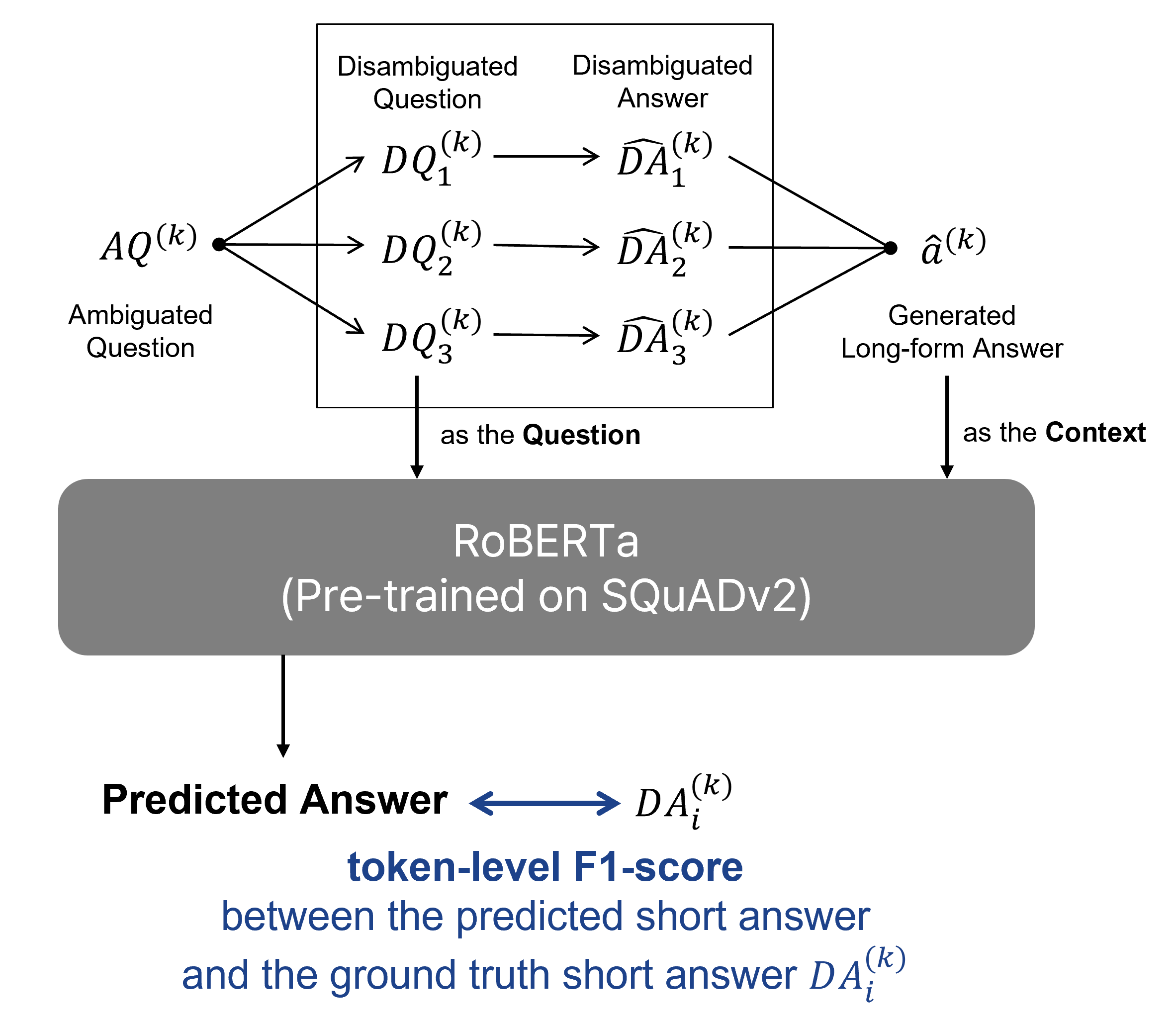 - 방법론을 통해 생성된 Long-form Answer를 Reading Comprehension task의 입력 Context로, Short Disambiguated Question을 Reading Comprehension task의 입력 Question으로 하여, 생성된 Predicted short answer와 ground truth short answer 간의 token-level F1-score를 측정함