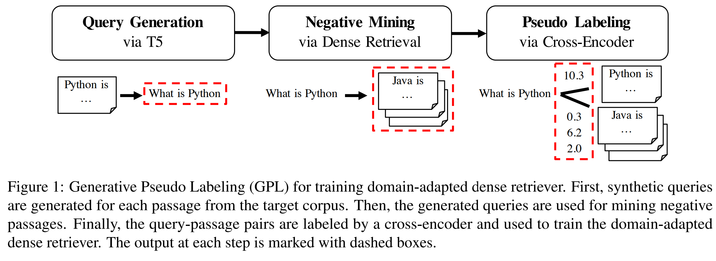 - unsupervised domain adaptation 방법론인 query generator와 cross-encoder의 pseudo labeling을 결합하는 방식의 Generative Pseudo Labeling (GPL)을 제안