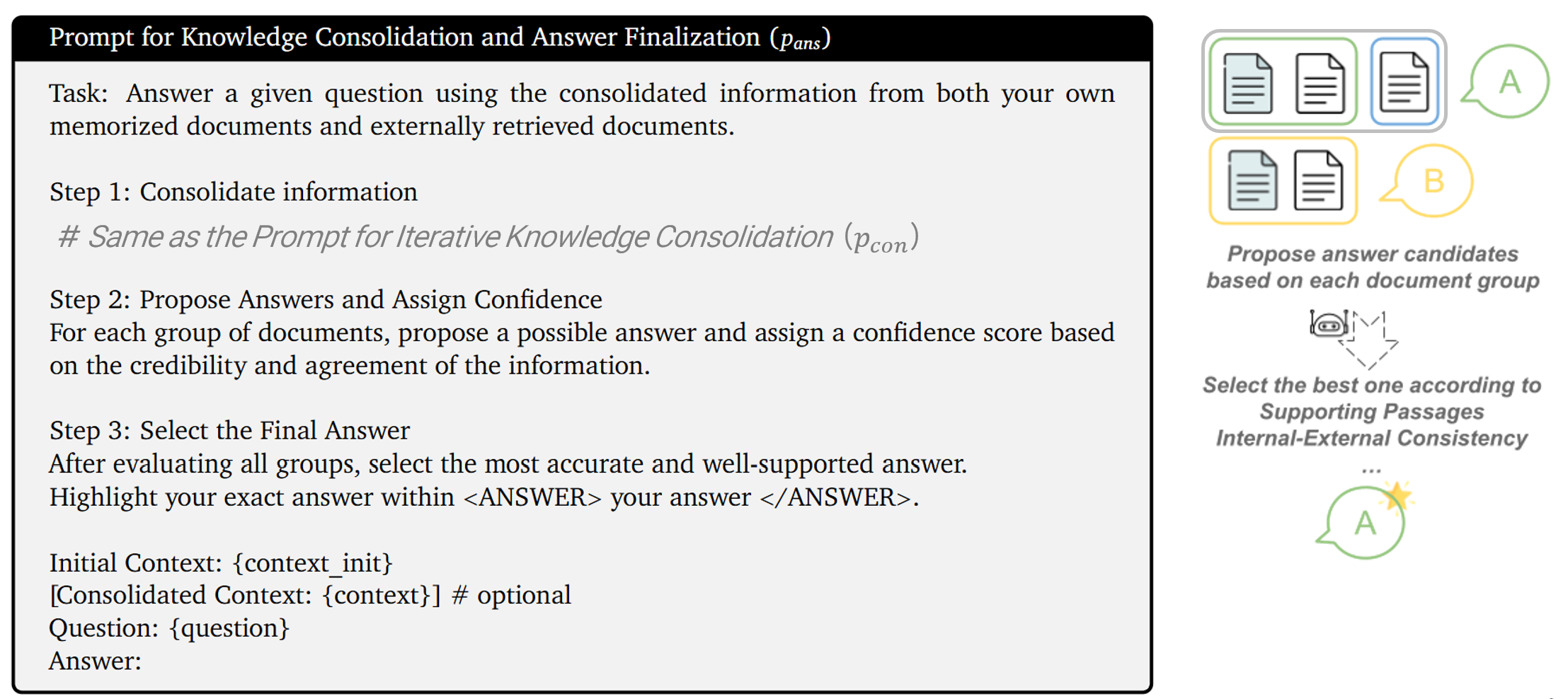 - 각각의 그룹으로부터 답변을 하나씩 생성한 후, 신뢰성을 고려하여 하나의 최종 답변을 선택하도록 LLM prompting