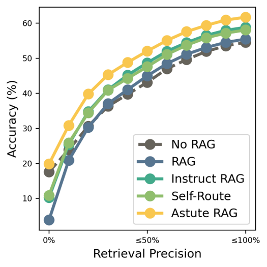 검색 품질이 매우 낮은 경우(Retrieval Precision이 거의 0에 가까울 때) 다른 베이스라인 모델들은 No RAG에 비해 성능이 저하된 반면, Astute RAG만이 이 기준을 넘는 성능을 보임
