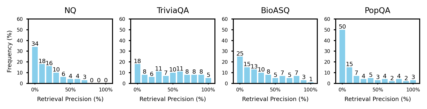 NQ, TriviaQA, BioASQ, PopQA → 짧은 형식의 QA 데이터셋