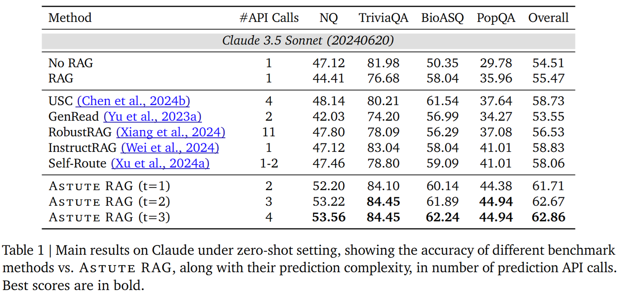 - 반면, Astute RAG는 모든 데이터셋에서 일관되게 baseline을 능가함