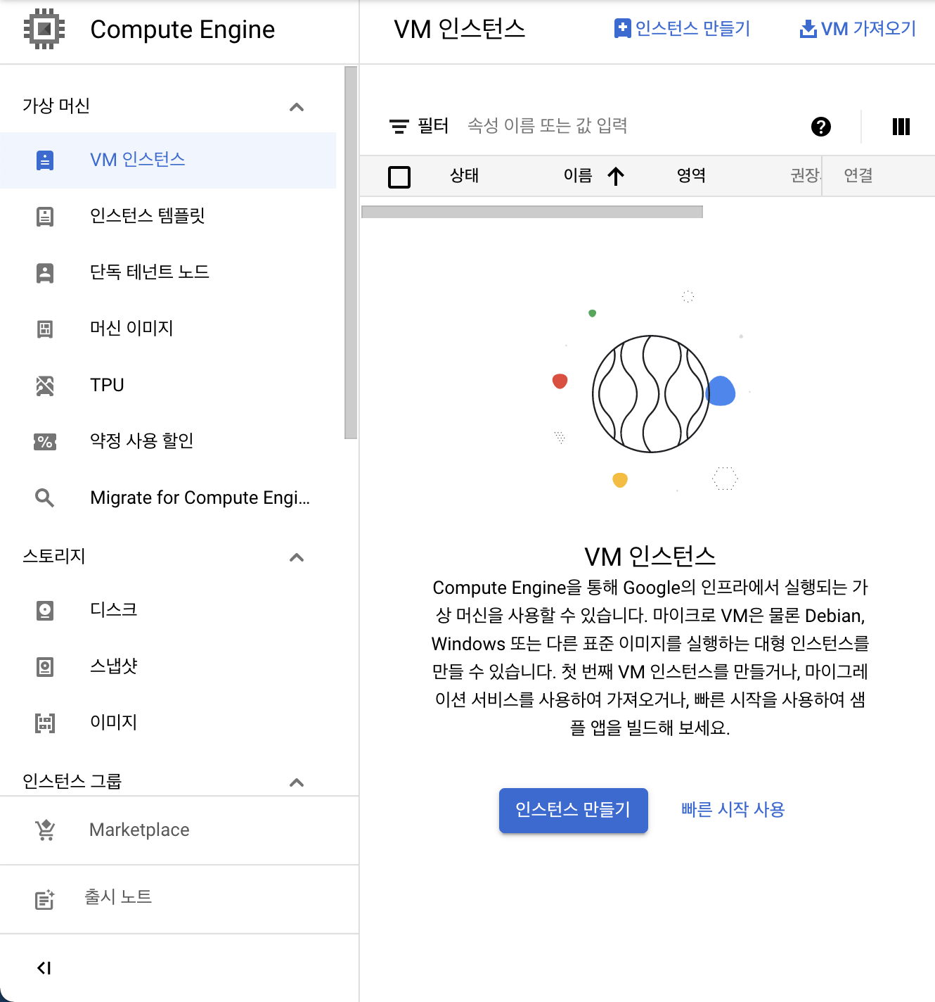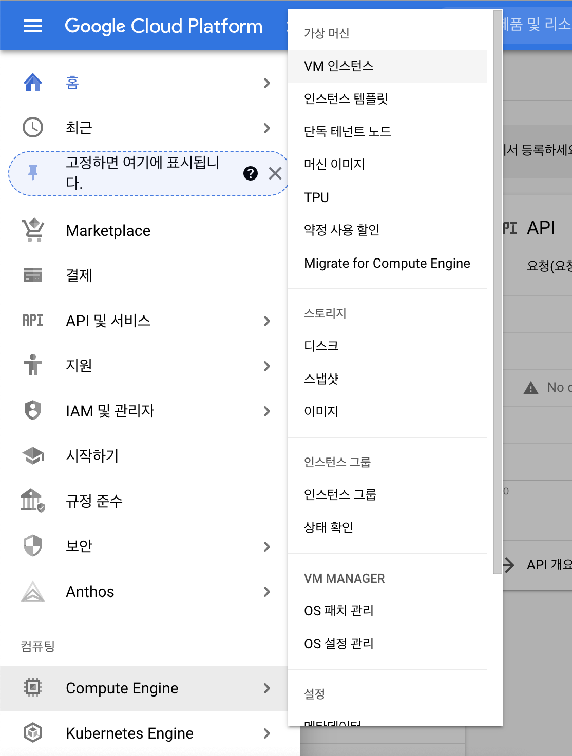 메뉴에서 Compute Engine > VM 인스턴스 메뉴로 들어가, Compute Engine API를 활성화시킨다.