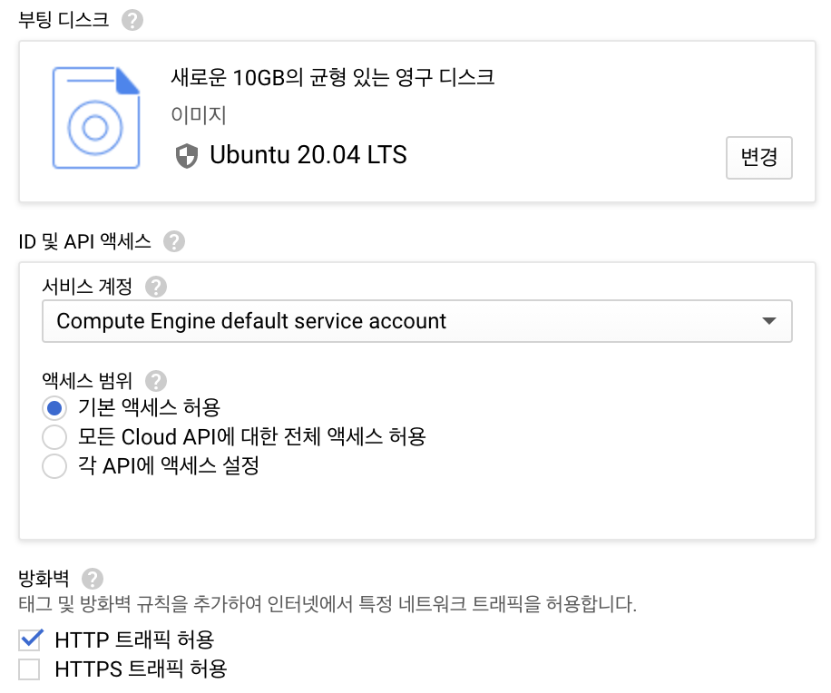 부팅 디스크 메뉴에서 Ubuntu 20.04 LTS로 설정해주고, 방화벽 메뉴에 'HTTP 트래픽 허용'을 체크해준다.