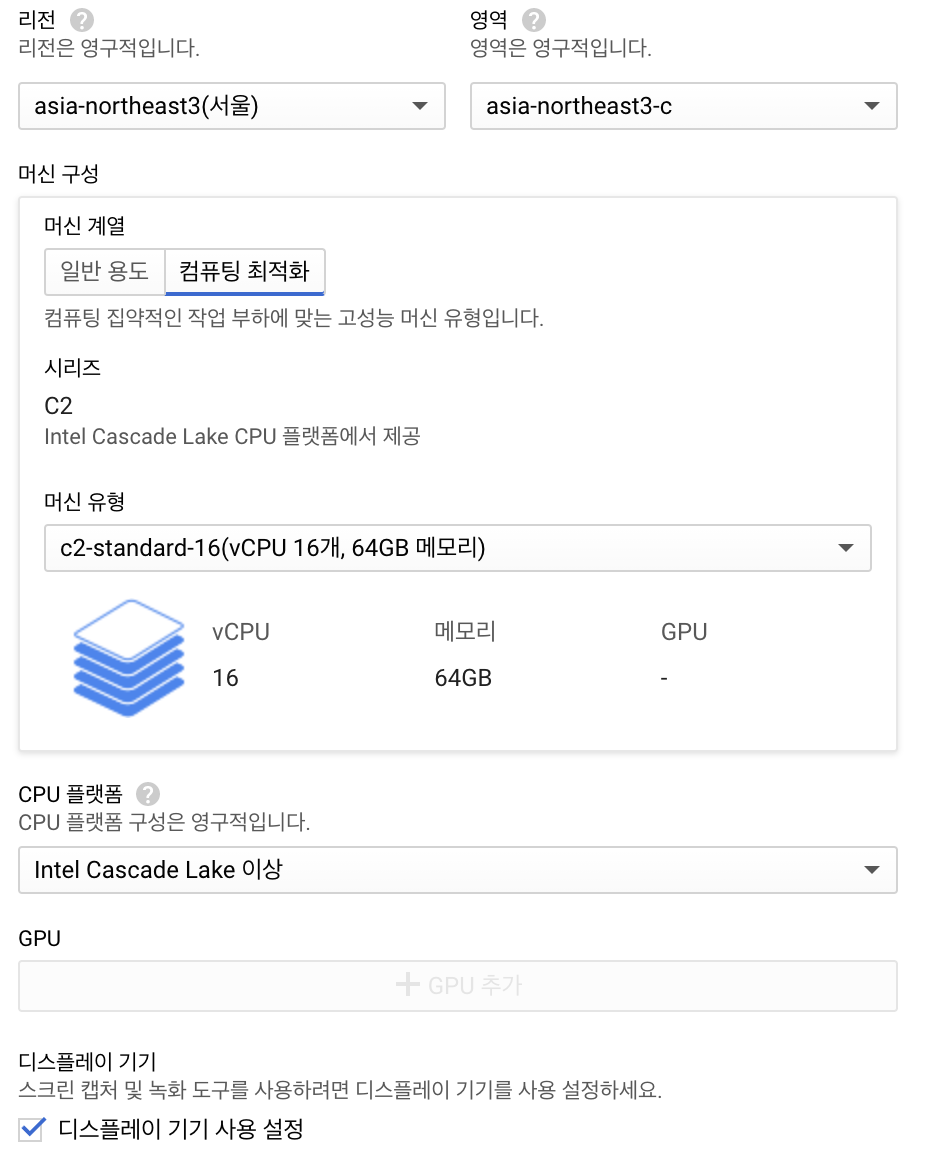 성능은 vCPU 8개, 메모리 32GB를 사용했다. (vCPU 16개, 메모리 64GB를 선택하면 할당량 제한 때문에 사용하지 못한다는 알림이 뜬다.)