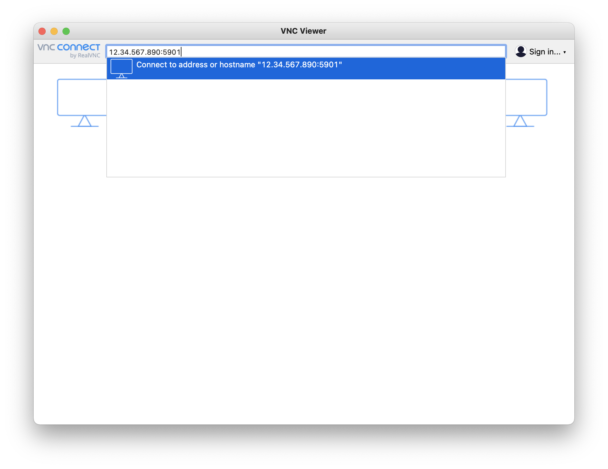 예를 들어, 외부 IP 주소가 12.34.567.890이고, 포트번호가 5901이라면, 아래와 같이 VNC Viewer 프로그램에 입력한다.