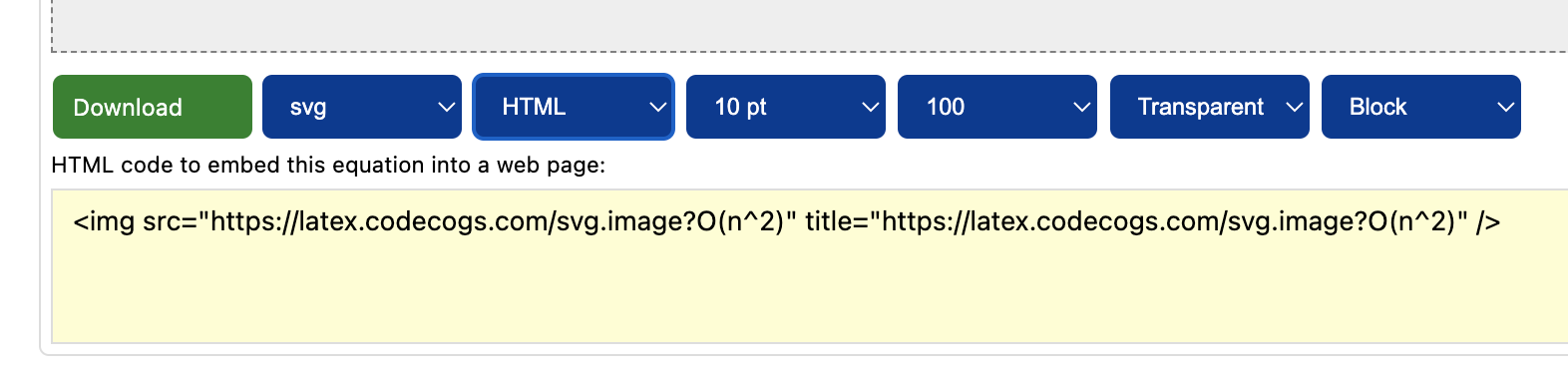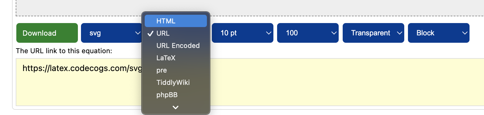 Download svg gif png pdf emf HTML URL URL Encoded LaTeX pre TiddlyWiki phpBB WordPress 5 pt 9 pt 10 pt 12 pt 18 pt 20 pt 50 80 100 110 120 150 200 300 Transparent White Black Red Green Blue Inline Block