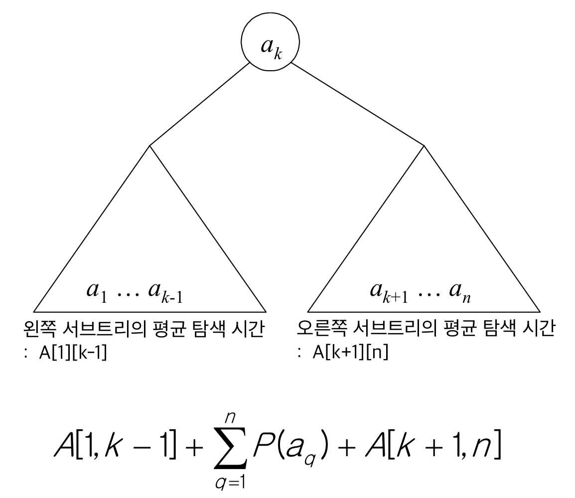 - 트리 내의 키와 각 키가 탐색될 확률이 주어져 있을 때 그 트리의 평균 탐색 비용, 즉, 평균 비교 횟수를 계산하고 이를 최소화하는 탐색 트리를 구축하는 문제