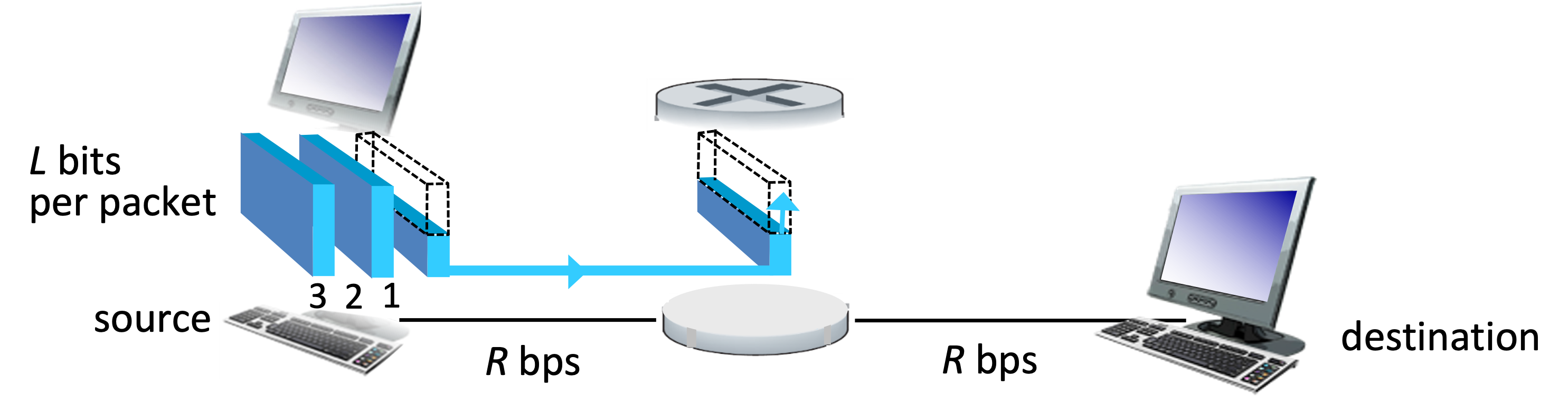 - Packet switching으로 source에서 destination까지 1번 패킷이 전달될 때 걸리는 시간을 계산해보자. 각 링크는 초당 R bps의 속도로 패킷을 전송하고, 각 패킷은 L bit이다. (전파지연은 무시)