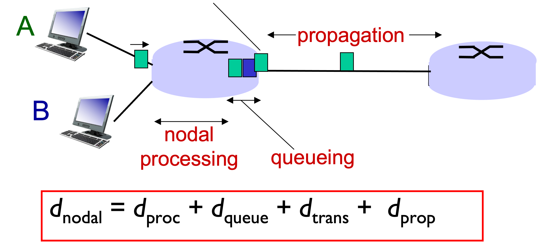 따라서 전체 노드 지연은 d(nodal, 전체) = d(proc, 처리) + d(queue, 큐잉) + d(trans, 전송) + d(prop, 전파)으로 표현한다.