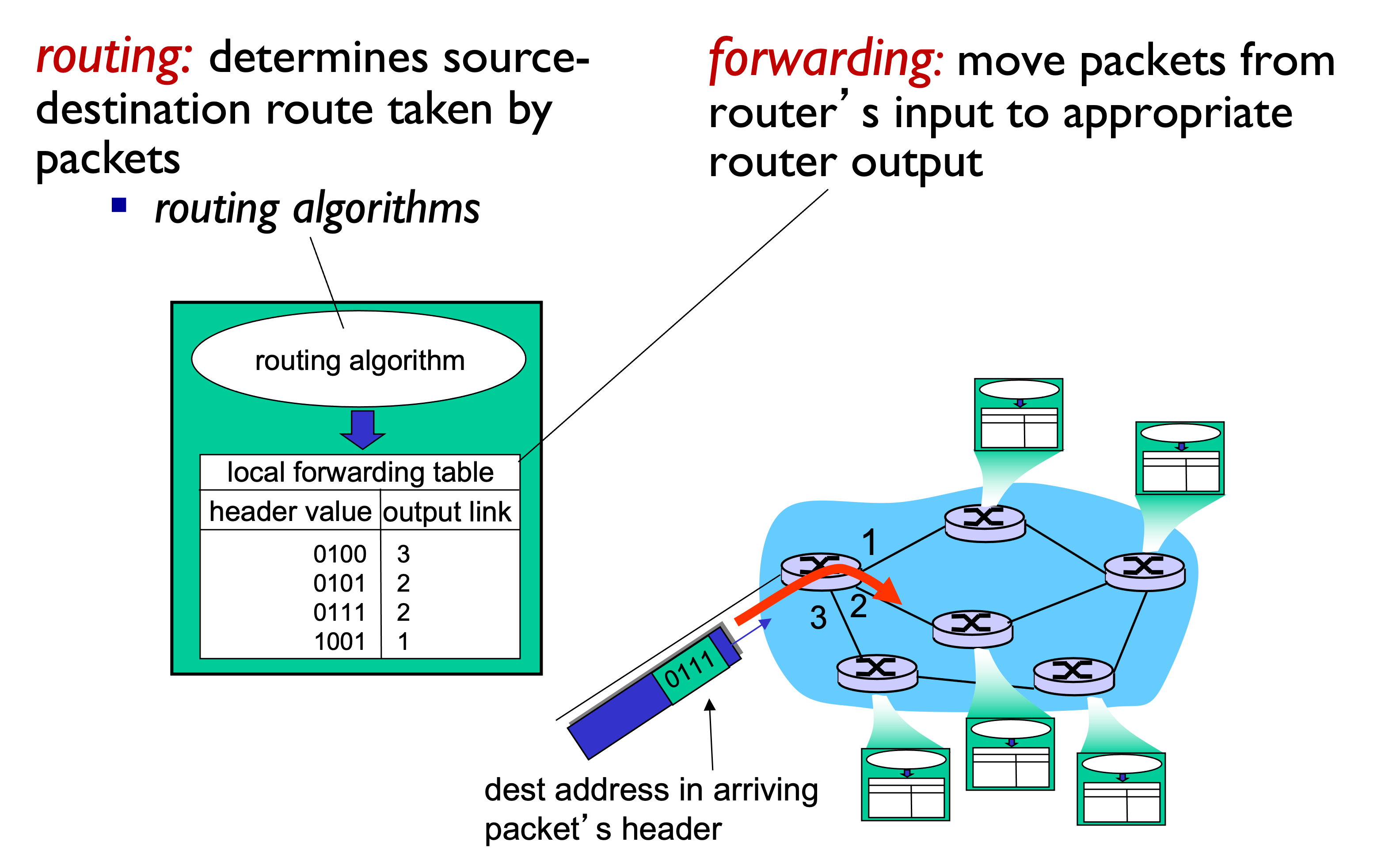 이 때, 판단해서 보내는 기능을 Forwarding이라고 하고, local forwarding table을 만드는 기능을 Routing이라고 한다.